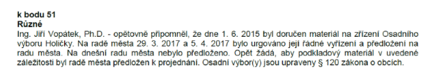• 5. 4. 2017, se nic nedělo, nebylo na radu města předloženo. Na základě mé opětovné žádosti byla započata diskuse o území Holiček z pohledu osadního výboru. V diskusi se nerespektovalo území jasně vymezené části obce, kterou Holičky jsou.