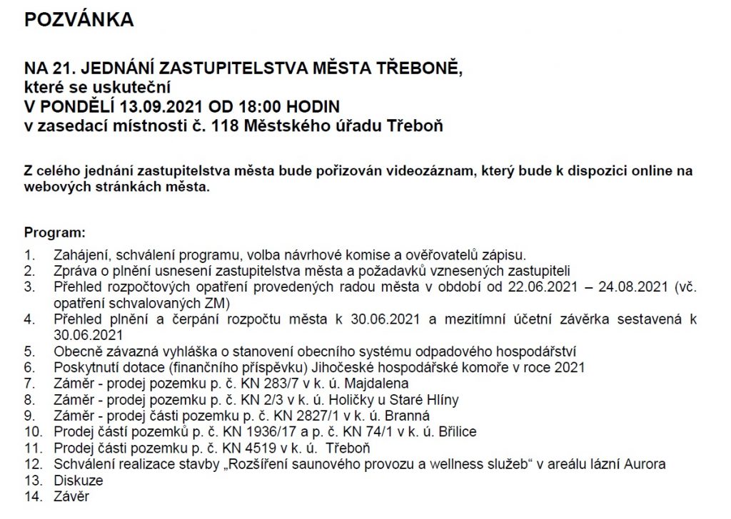 Sledujte jednání zastupitelstva města Třeboň, které se koná v pondělí 13. 9. 2021, od 18 h v zasedací místnosti č. 118 Městského úřadu Třeboň