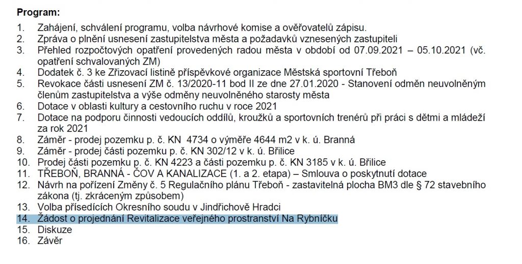 Klíčovým bodem bude zejména projednání žádosti občanů ve věci revitalizace veřejného prostranství Na Rybníčku! Předmětnou revitalizaci tohoto veřejného prostranství současné vedení města tlačí hlava nehlava. Na jiné názory vedení města nebere ohled …. . Přijďte vyjádřit svůj názor!