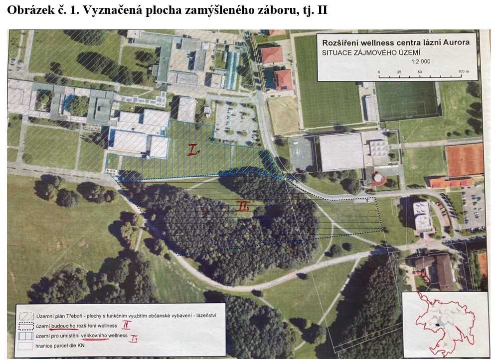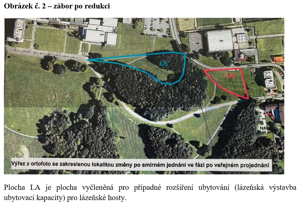 Až tato stanoviska vedení města Třeboň donutila svůj záměr ve věci záboru lázeňského parku „umravnit“ a přehodnotit, kdy došlo k výraznému zmenšení záboru lázeňského parku z původního zamýšleného rozsahu cca 1,9 ha na cca 0,9 ha. Viz „umravněná“ varianta na obrázku č. 2 (zábor po redukci).