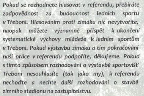 Zvolení zastupitelé mají z titulu svých funkcí a mandátu prosazovat to, co chce většina občanů či také to, co bylo součástí volebních programů v posledních komunálních volbách 2014. Nelze souhlasit s tím, že zvolení zástupci mohou ve věcech veřejných rozhodovat neomezeně a to jen proto, že mají nyní moc či mandát. Zvláště v těch věcech, které nemají podporu širší veřejnosti či jsou veřejností diskutovány. K zásadnímu rozhodování je zapotřebí mandát od občanů (voličů) a ten k výstavbě plnohodnotného zimního stadionu v posledních komunálních volbách roku 2014 nebyl získán. Současně se ukázalo, že občané, kteří se referenda zúčastnili, zimák nechtějí.